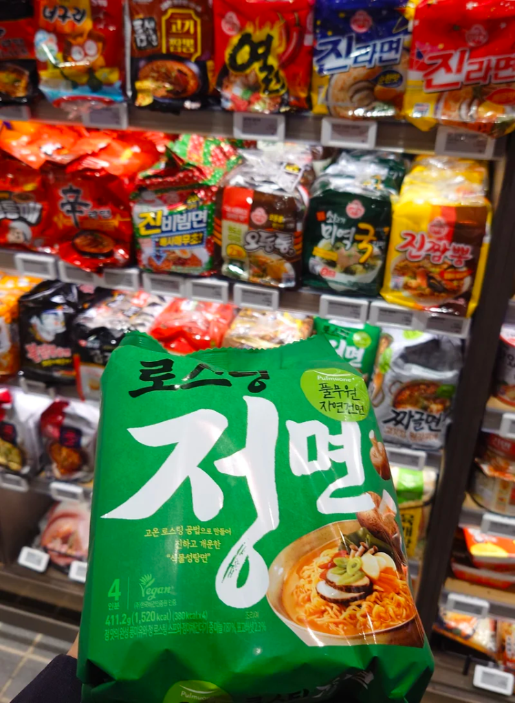 자연은 맛있다 정면 / 自然はおいしい製麺シリーズの緑色がヴィーガンラーメンです。しっかり辛いですが野菜ダシで、何より油で揚げておらず、完全植物性が嬉しいです。肉や油の重さは避けながらも、韓国らしい味が楽しめるので、家族への土産にもおすすめです。